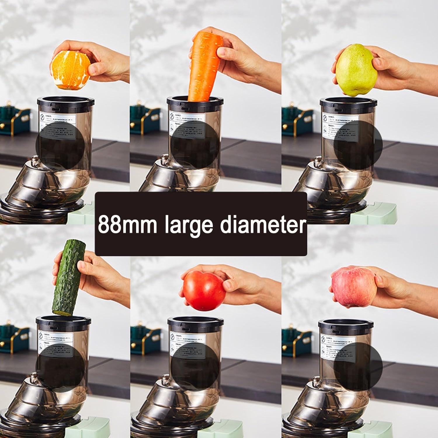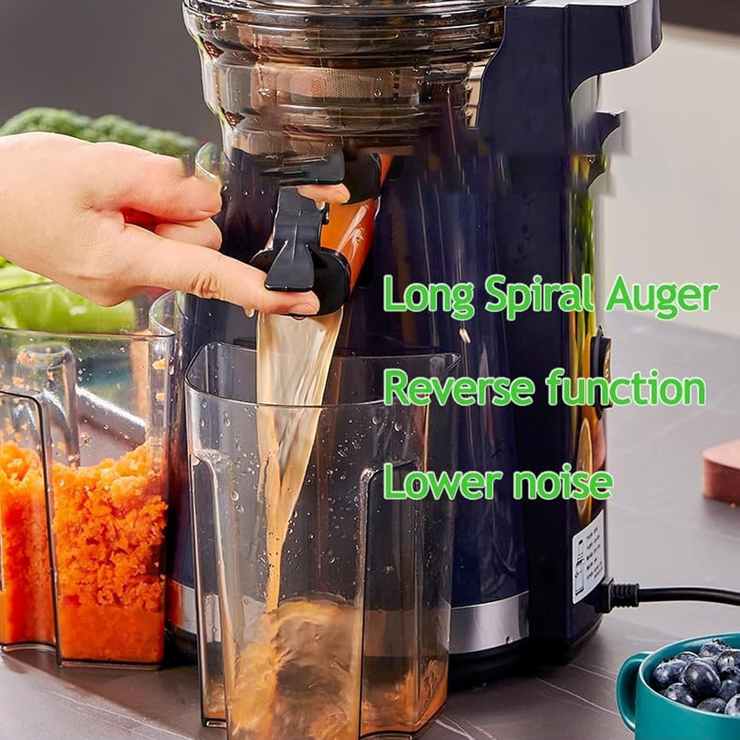 Description: It features a dual-slot design that automatically separates the pulp and juice and extracts them into two different slots, making it very easy to use. This slow juicer is designed for efficient extraction, resulting in juice yields of up to 96%. Don't waste your energy and refresh your life with our slow juicer! Specification: Color: Blue Rotation Speed: 45rpm Power: 250W Noise: <60db Feed Port Diameter: 82mm/3.4" Product Size: 22.9cm x 20.1cm x 49.7cm/9.01" x 7.91" x 19.57" Gross Weight: 5.2KG/11.46LBS Application: It is suitable for squeezing fruits, such as lime, lemon, orange, grape, pear, etc. It can also be used to make soy milk, baby supplement, DIY cold drinks and fruit and vegetable noodles, etc.