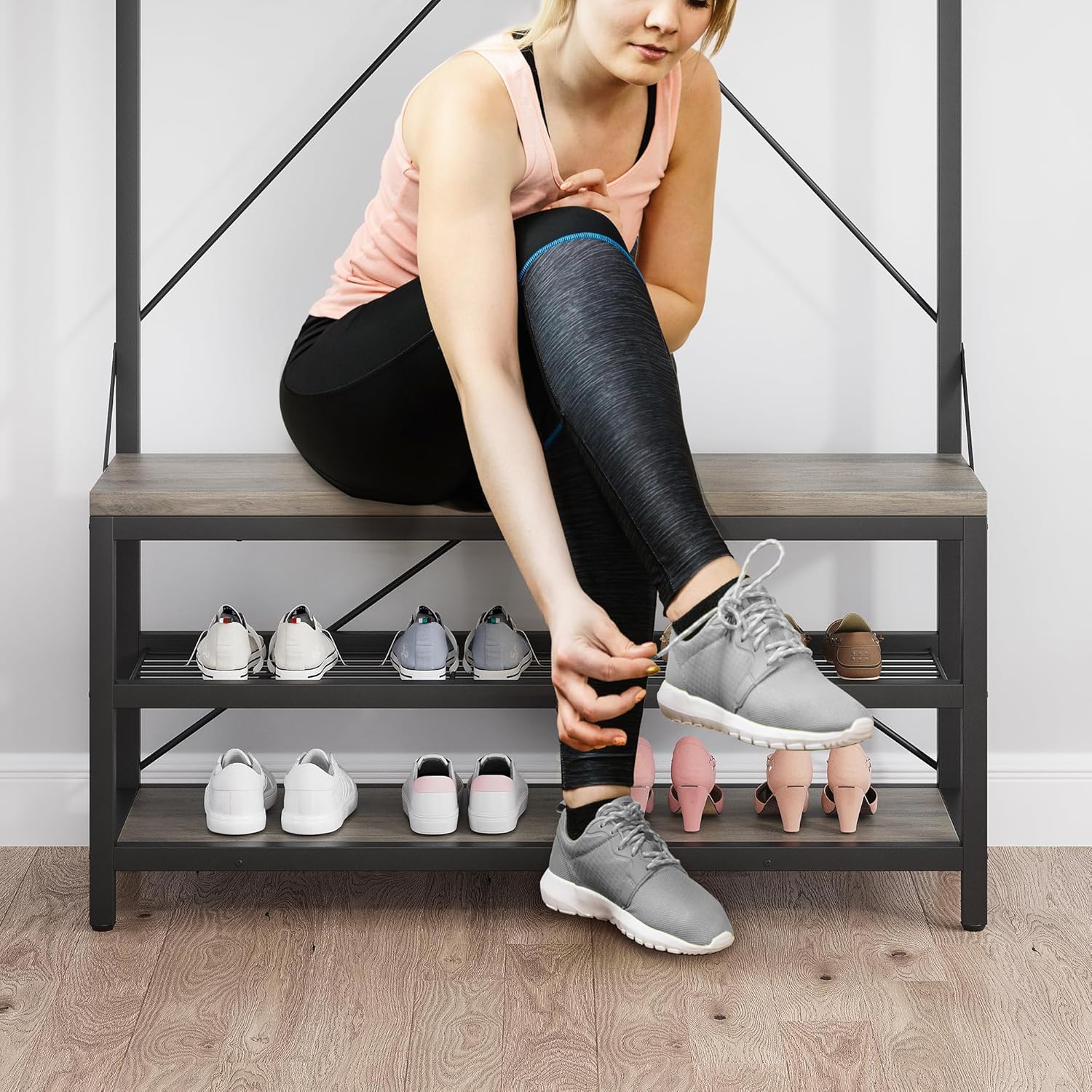 This industrial windbreaker hat rack features a powerful multi hanging design with 8 sturdy hooks and hanging crossbars, making it easy to accommodate jackets, bags, and scarves for the whole family. The spacious shoe rack and storage shelves at the bottom keep shoes and daily clutter organized, while the integrated bench makes changing shoes comfortable and effortless. Strengthening the steel frame ensures a stable and durable structure, while the imitation wood grain finish injects a warm texture. Whether placed in the lobby, hallway, or as a room partition, it can become an indispensable entry and exit hub in your home with its powerful storage capacity, humanized functional integration, and timeless industrial farmhouse aesthetics - making every entry and exit door calm and orderly.