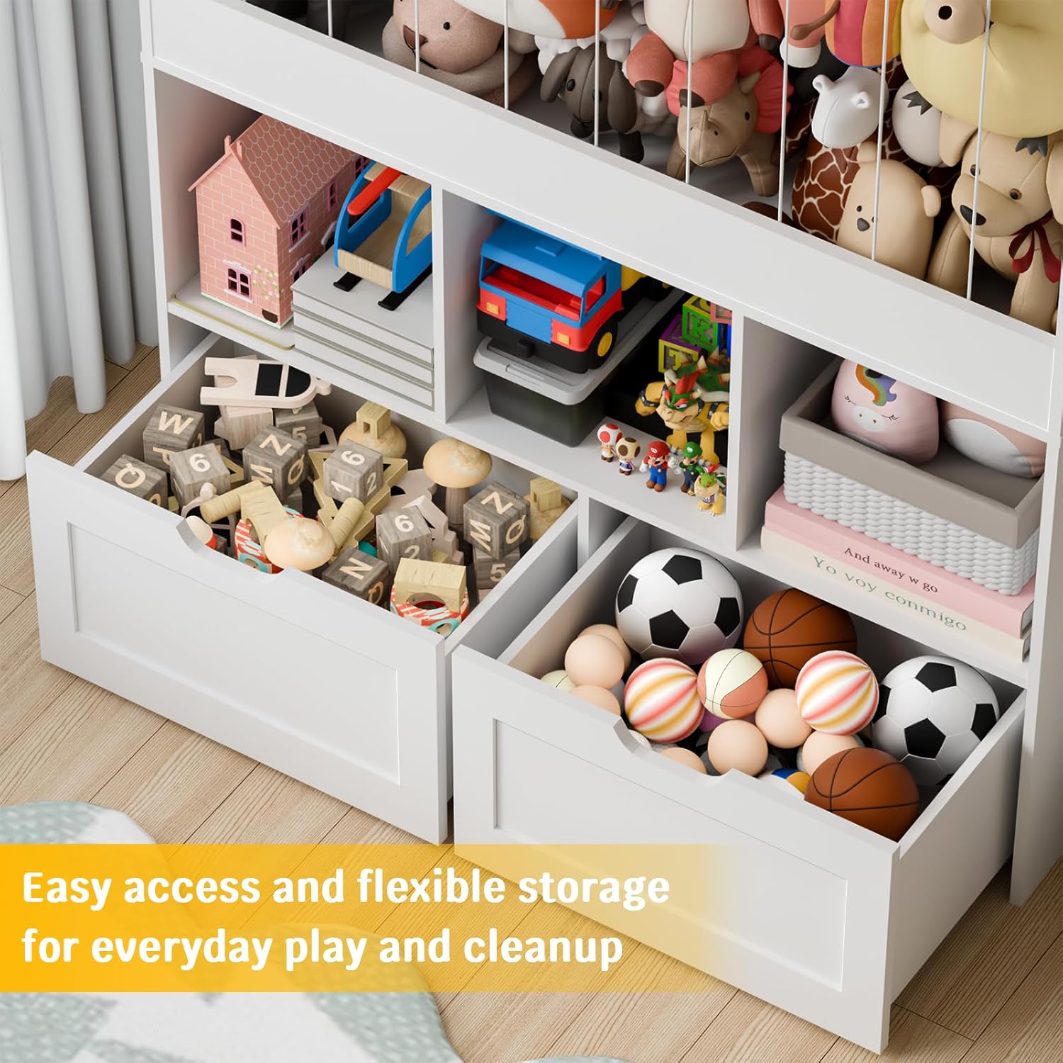 | Additional Features | Bookshelf, Open Storage Compartments, Stuffed Animal Storage, Wheeled Toy Storage Bin |