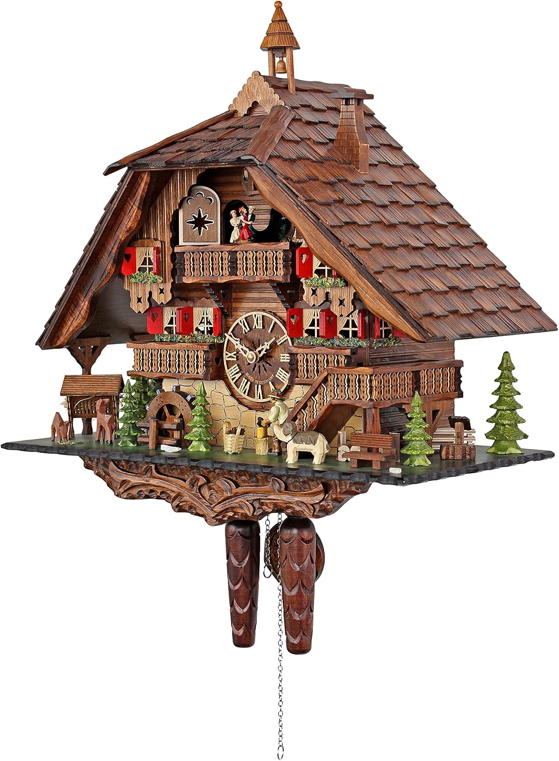 This is a cuckoo clock with a typical Black Forest house that has a shingled roof with a bell tower, a chimney and an attic window. The house is decorated with detailed balconies and a stair case, fir trees and feeding forest animals. The wood cutter chops wood on the hour in time to the cuckoo call and its echo. One of 12 different alternating melodies follows, while the water wheel turns and the figurines in their Black Forest traditional costume dance around to the music. A light sensor automatically turns off the cuckoo sound and the music at night, or they can be turned off anytime by means of a manual switch. Clock Movement: Battery operated movement with manual and automatic night-off (Sensor). Musical Movement: Twelve different melodies: Cuckoo Waltz, Bayrischer Ländler, Waterwheel in the Black Forest, The Woodchopper March, Happy Wanderer, Trink Brüderlein Trink, In München steht ein Hofbräuhaus, For Elise, Lorelei, Home Sweet Home, Clementine, Salut d’amour. Clock Face: wooden dial, diameter 3,5 Inch (9 cm). Dancing Figurines: Wooden Black Forest Figurines. Batteries: Three C batteries (not included) Color: Walnut dark