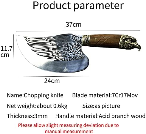 Wash by hand and dry with a soft cloth immediately after useKnife Type:Chopping knifeFeature:Eco-FriendlyMaterial:7Cr17mov stainless steelItem Include:1 Knifeor 1 Knife with 1 coverlength: 370 mmblade length:240 mmblade width: 11.7 mmthickness:3 mmNOTE:1.The entire process of production of this knife is completely manual.2.The surface of the forge knife is rough not as smooth as the knife produced by machines, but it did show the characteristics of the forging knife.3.Please allow slight measuring deviation due to manual measurement.