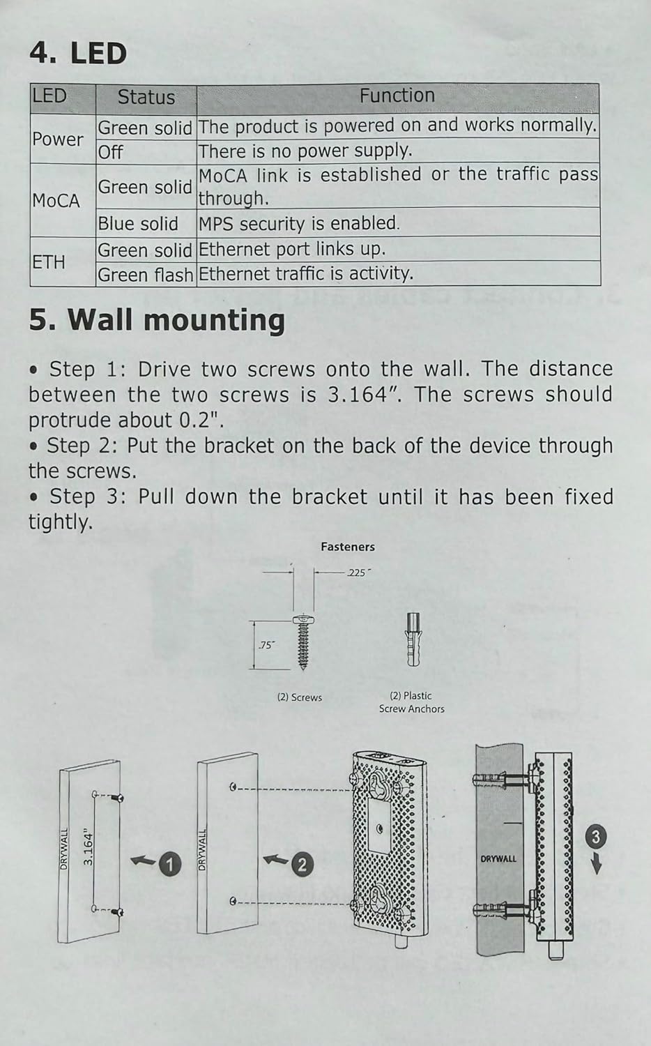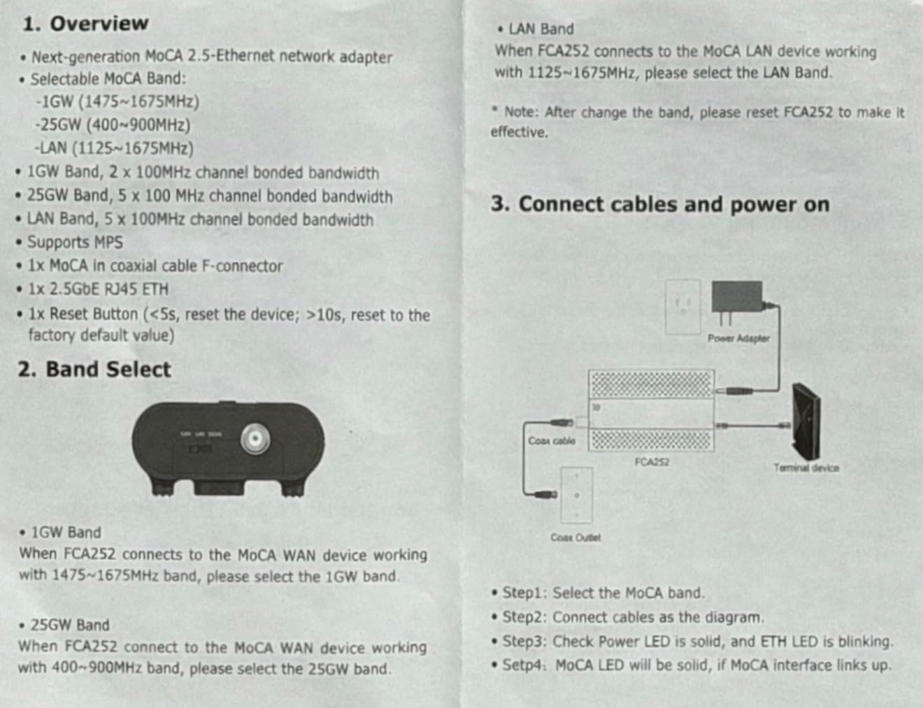 The MoCA adapter shown is a compact networking device designed to deliver high-speed wired internet by utilizing existing coaxial cable infrastructure. It features a coax input for receiving the MoCA signal, an Ethernet port for connecting to routers or devices, and a power input to keep the unit running continuously. The adapter supports advanced MoCA 2.5 technology, allowing for strong throughput and stable performance across multiple frequency bands, making it ideal for applications like streaming, gaming, and whole-home networking. LED indicators on the unit provide quick status updates for power, MoCA link, and Ethernet activity, giving users an easy way to verify connectivity. Built with a simple, durable design, the adapter can be placed on a flat surface or mounted to a wall, offering a reliable and efficient solution for extending a wired network without installing new Ethernet cabling.