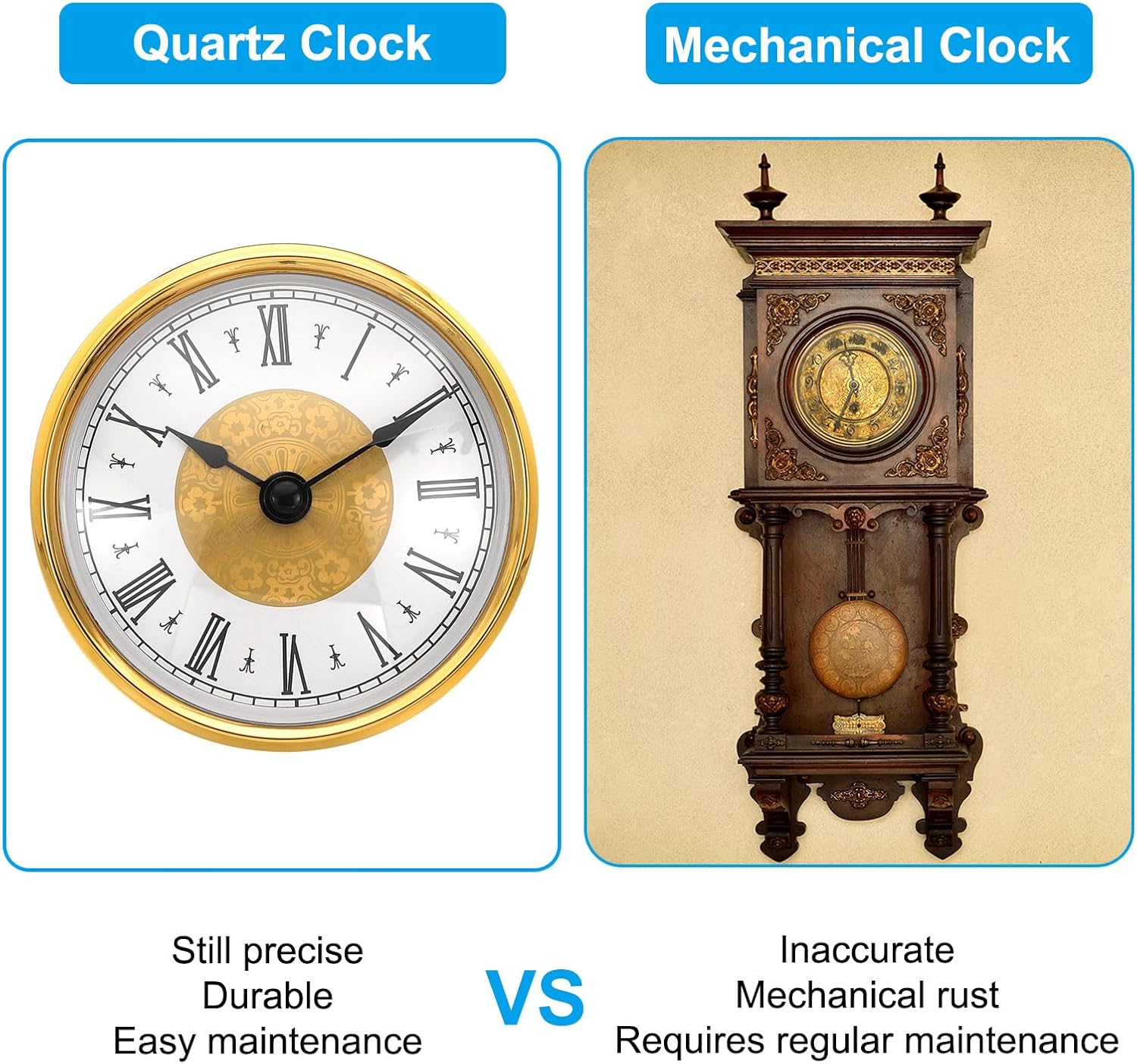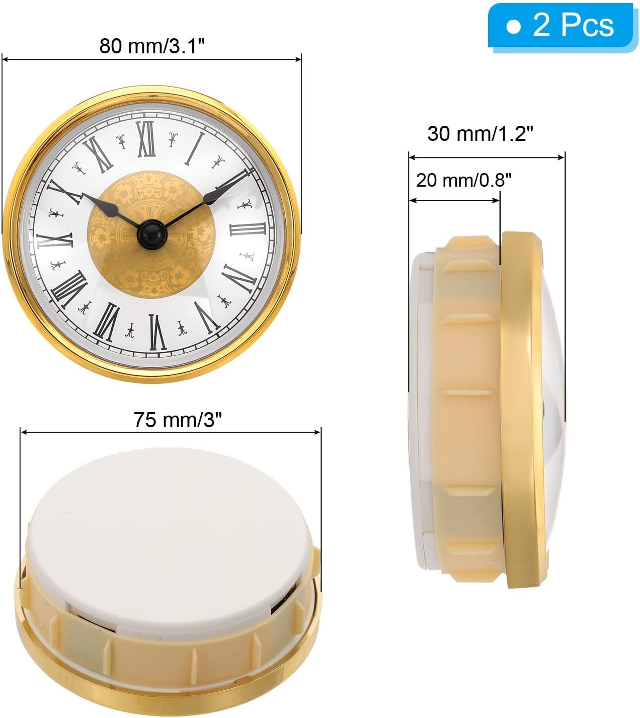 Our clock insert is perfect for various settings including kitchens, bedrooms, offices, meeting rooms, living rooms, game rooms, libraries, bars, and restaurants. Its classic and vintage design effortlessly decorates any room, adding a touch of elegance and enhancing the overall aesthetic appeal of your space.SpecificationClock Size: 80 x 30 mm/3.1 x 1.2 Inch(OD*T)Mounting Size: 75 x 20 mm/3 x 0.8 Inch(OD.*T)Material: Plastic; Metal; Quartz MovementPower Type: AA Battery (Not Included)Color: Gold TonePacking List: 2 Pcs x Clock InsertAdvantage1. The sturdy plastic frame and high transparency lens are easy to clean and prevent dust from entering the dial.2. The silent non-ticking sweep movement ensures that this wall clock operates without the constant ticking noise, and precise quartz movement ensures accurate time, suitable for use in quiet environments or bedrooms.3. Large and clear numbers design ensures that the time can be seen clearly from any angle. Stylish and elegant clocks can be a great decoration, adding beauty to your home.InstructionMiniature clock Assembly Insert Replacement fits many types of small glass and crystal clock quartz movements.Two different installation ways can meet your needs. Simply drill a hole in the wall or other material. Then insert the clock into your hole. The rubber band gasket can hold the clock securely in place.Or directly hang the clock on a hook using the small hole on the clock's back.Note1. Adjust the clock time before installing the battery. 2. The battery is not included.