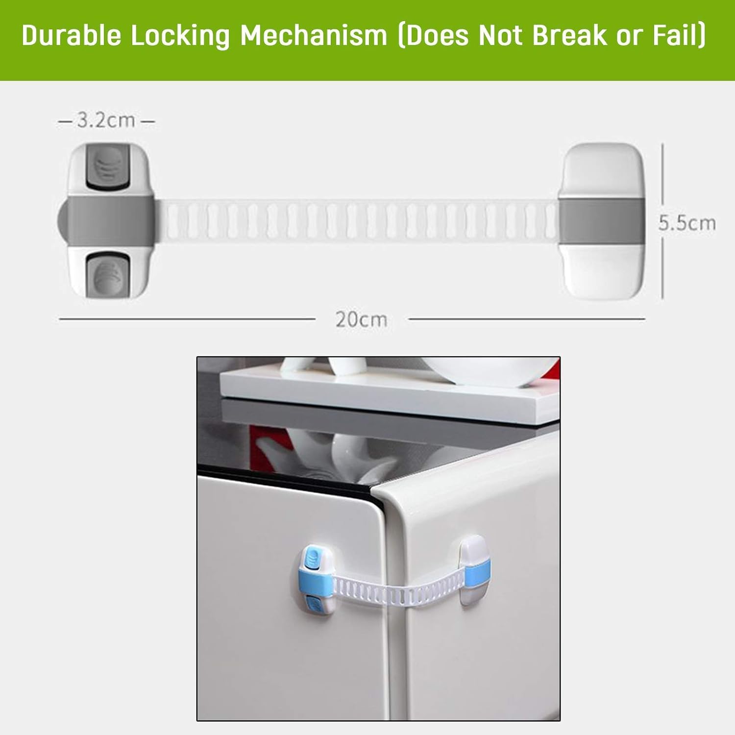 Protect your little ones with these versatile adjustable cabinet safety locks. The innovative white and blue design features a durable strap system that can be customized to fit various cabinet sizes and furniture types. Each pack with strong adhesive backing for secure installation. The adjustable length allows for flexible positioning while maintaining a reliable hold. Installation is straightforward - simply open the fixed end, adjust the strap length as needed, position correctly, and press firmly. For optimal adhesion, wait 24 hours after installation before use. These multi-purpose locks are ideal for securing cabinets, drawers, appliances, and other furniture items that need child-proofing. The thoughtful design allows adults to easily operate the lock while keeping curious little hands safely away from potentially dangerous items. Perfect for parents and caregivers looking to create a safer home environment without permanent modifications to their furniture.